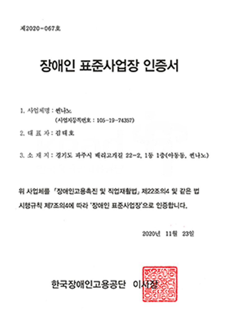 썬나노는 장애인 표준사업장 인증을 받은 공공기관 우선구매 대상 기업입니다