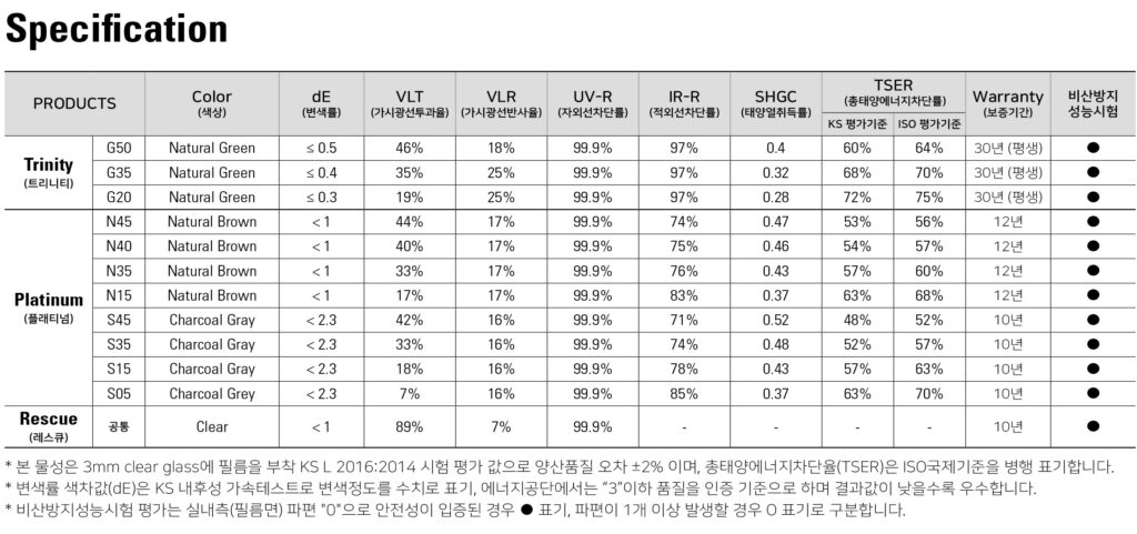 한국 표준규격 KSL 2016:2014에 의거, 45kg의 납산탄* 자루를 30cm 높이에서 필름을 시공한 5mm 일반 유리에 진자식으로 자유 낙하시켜 충격을 준 후, 깨져서 떨어진 유리 파편의 무게를 측정하여 표준 규격에 만족하는지 평가