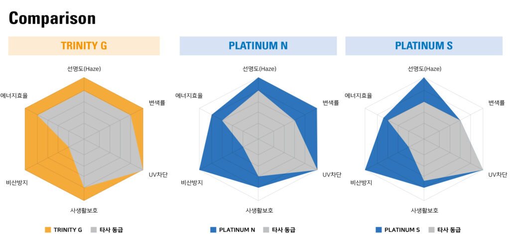 유해한 자외선을 99.9% 차단하여 피부노화 뿐만 아니라 시력을 보호해주며 가구와 커튼 장판 등 집기류의 탈·변색을 방지 (최소화) 합니다.